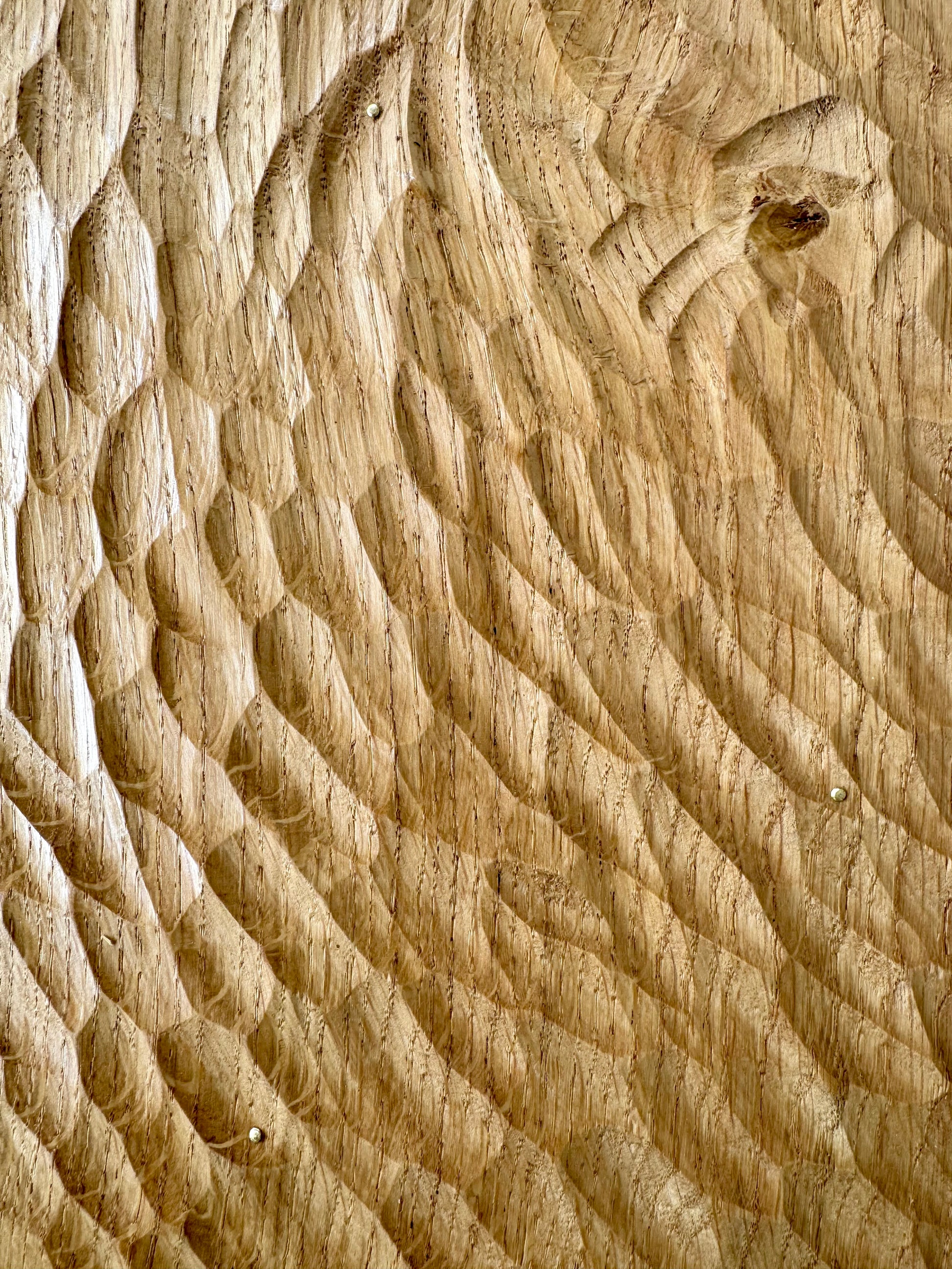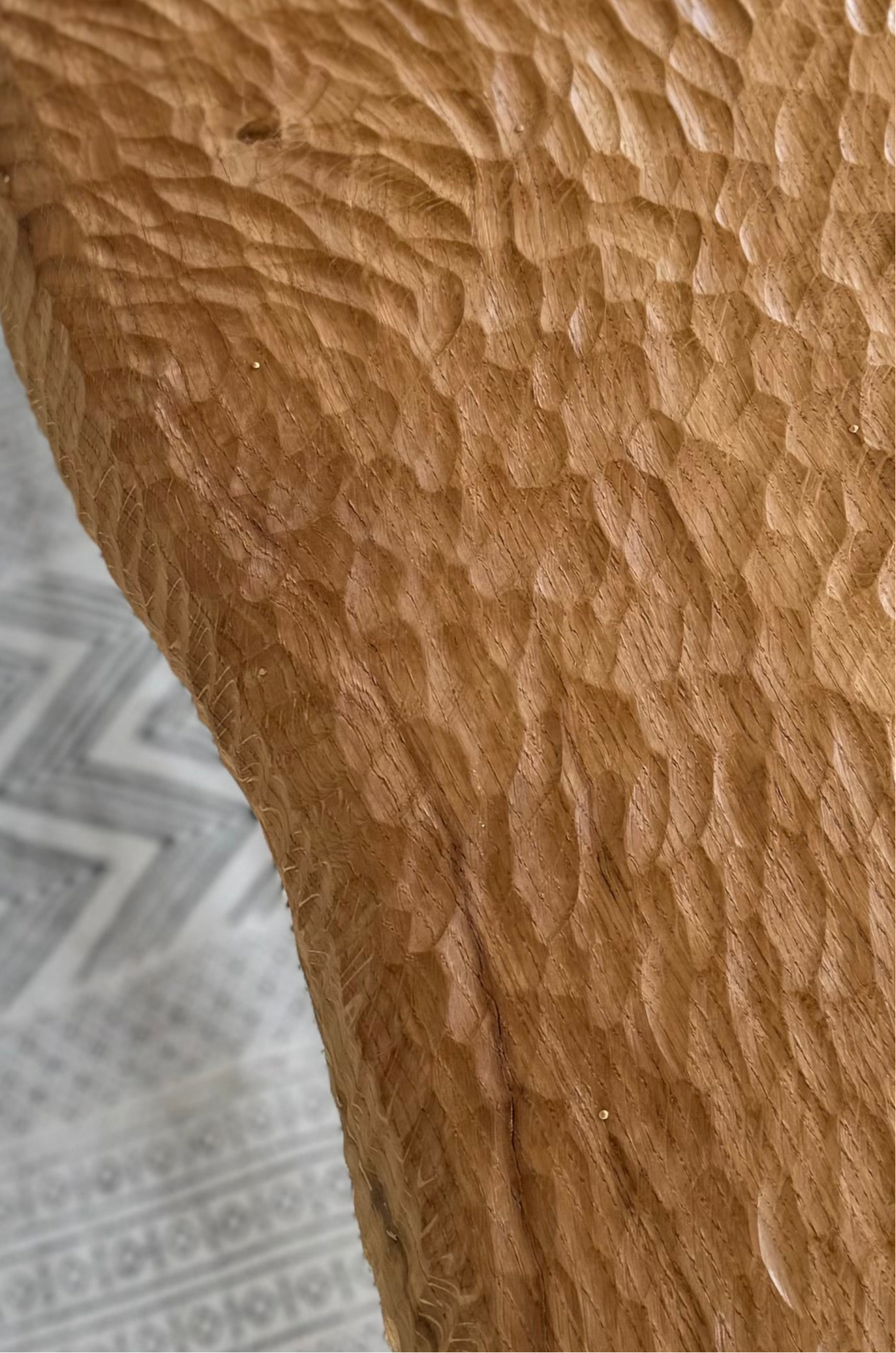 Sculpté dans une seule pièce de chêne, la matière, mise en valeur par le travail de sculpture, semble porter les stigmates des tempêtes et du temps.