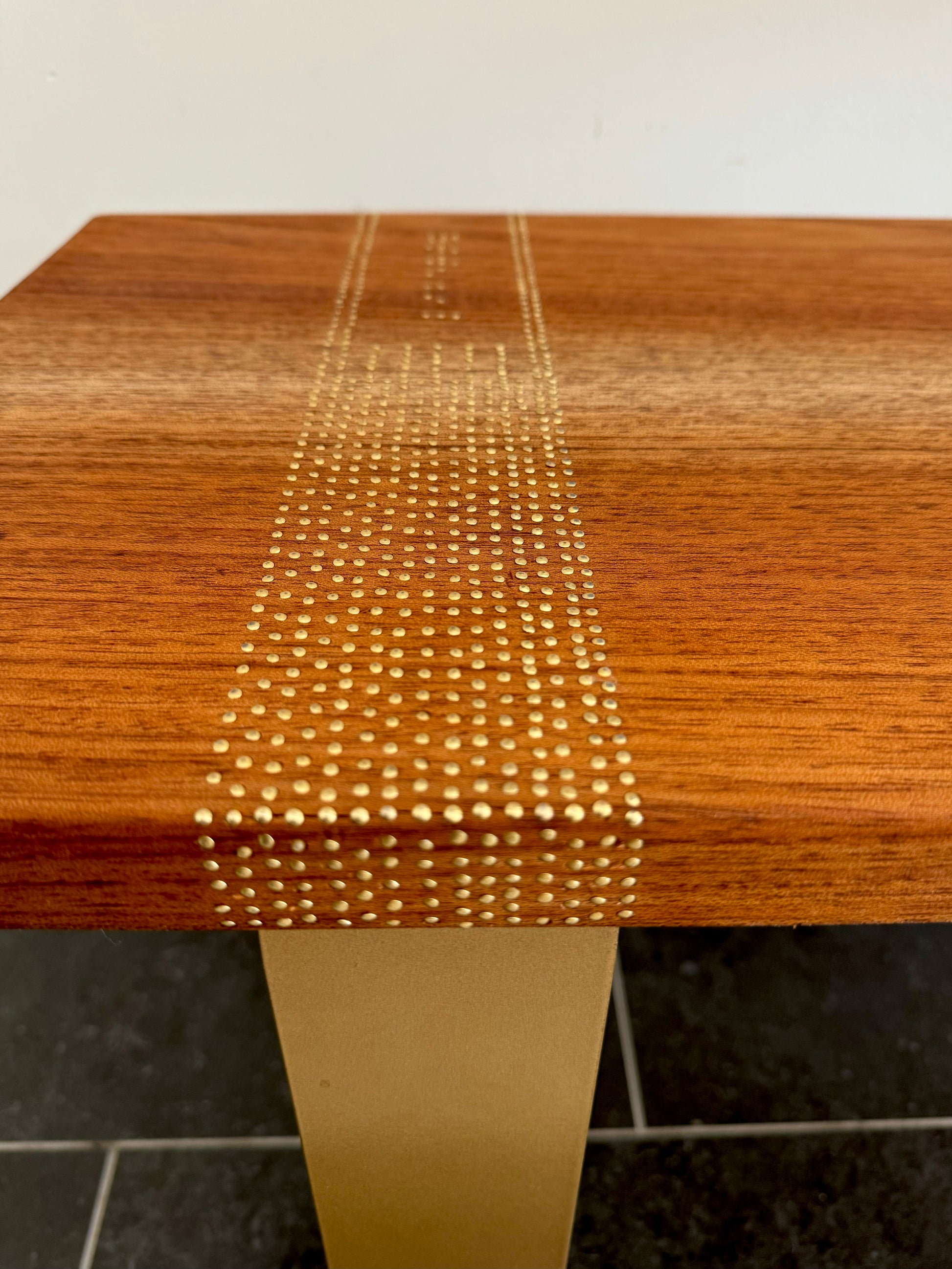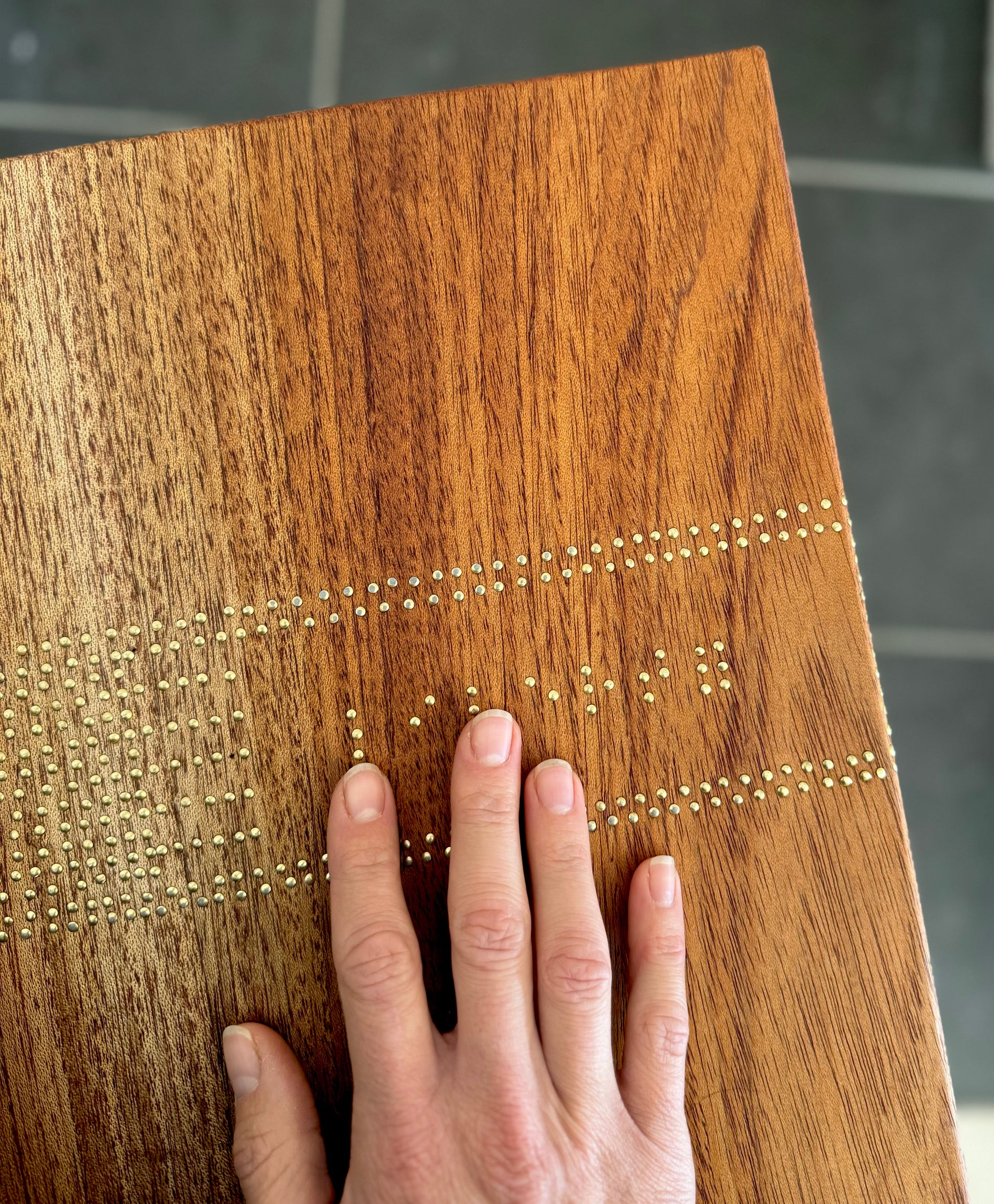 Le mot « amour » ou « liberté », incrusté en braille à l'aide de clous en laiton, invite à la caresse et à une réflexion sur la notion même de sentir les mots.