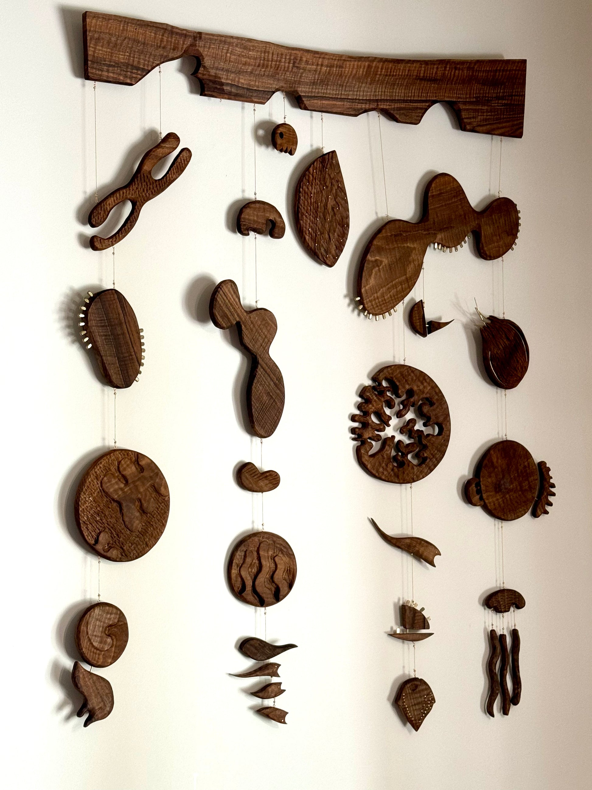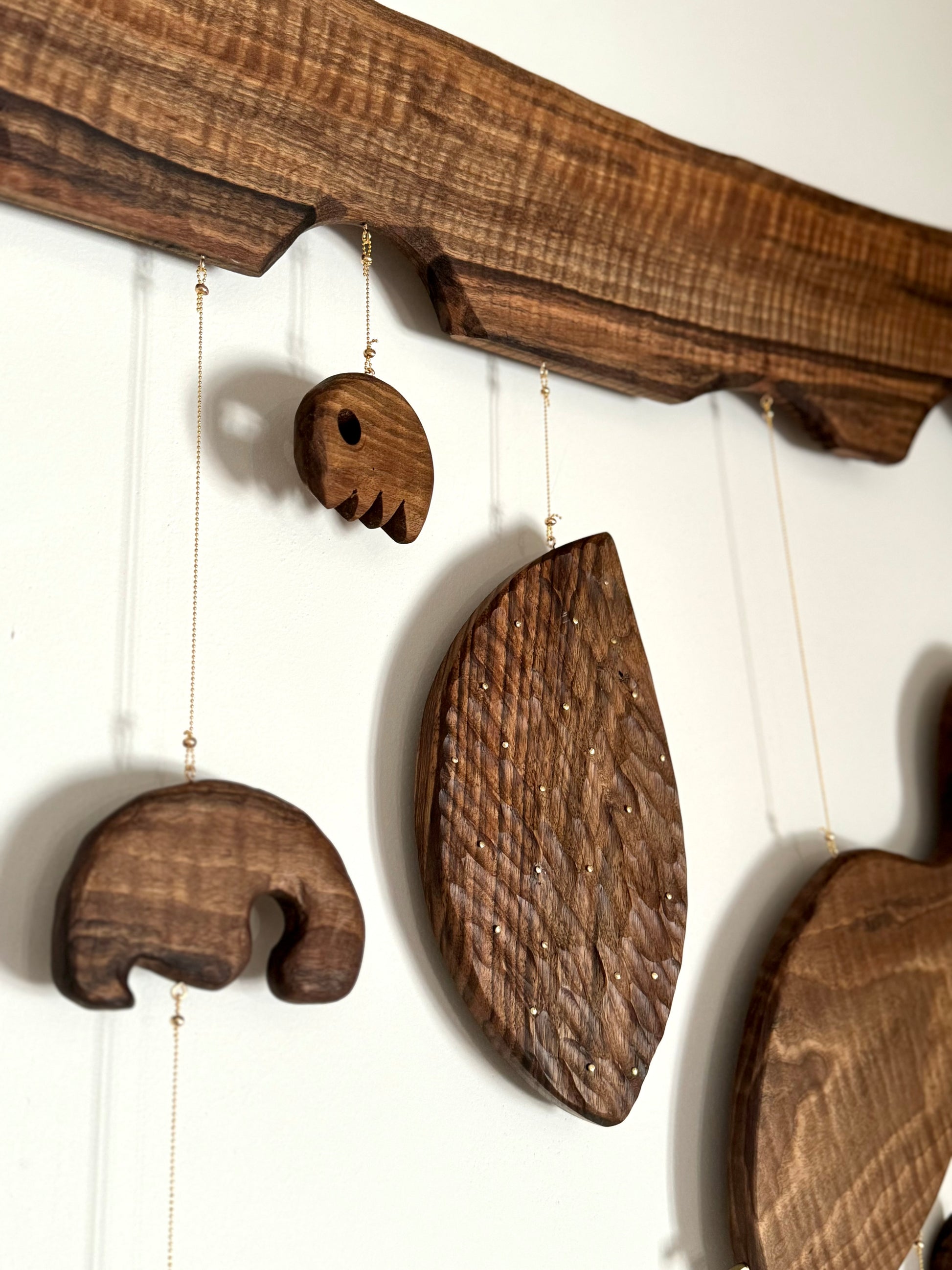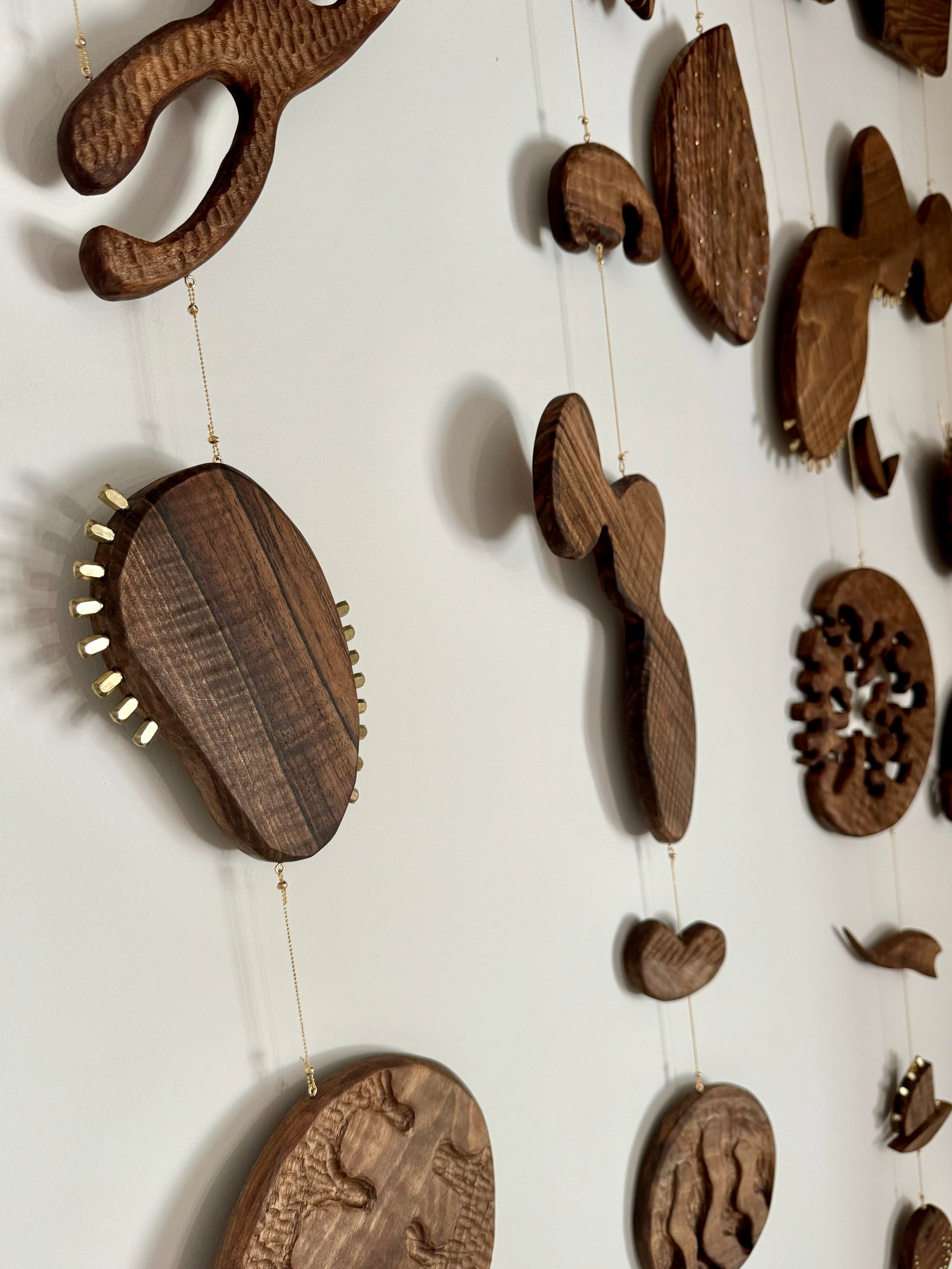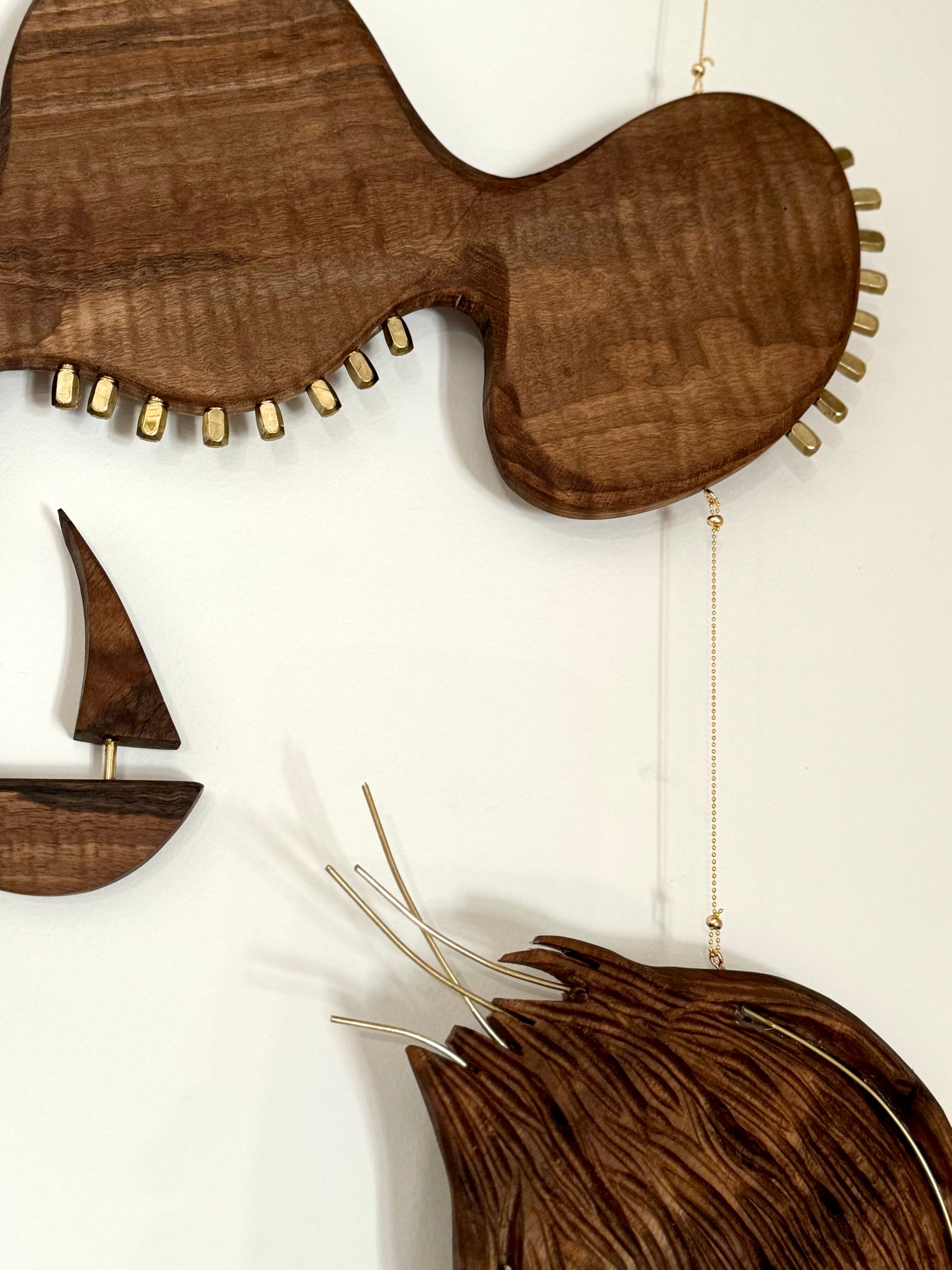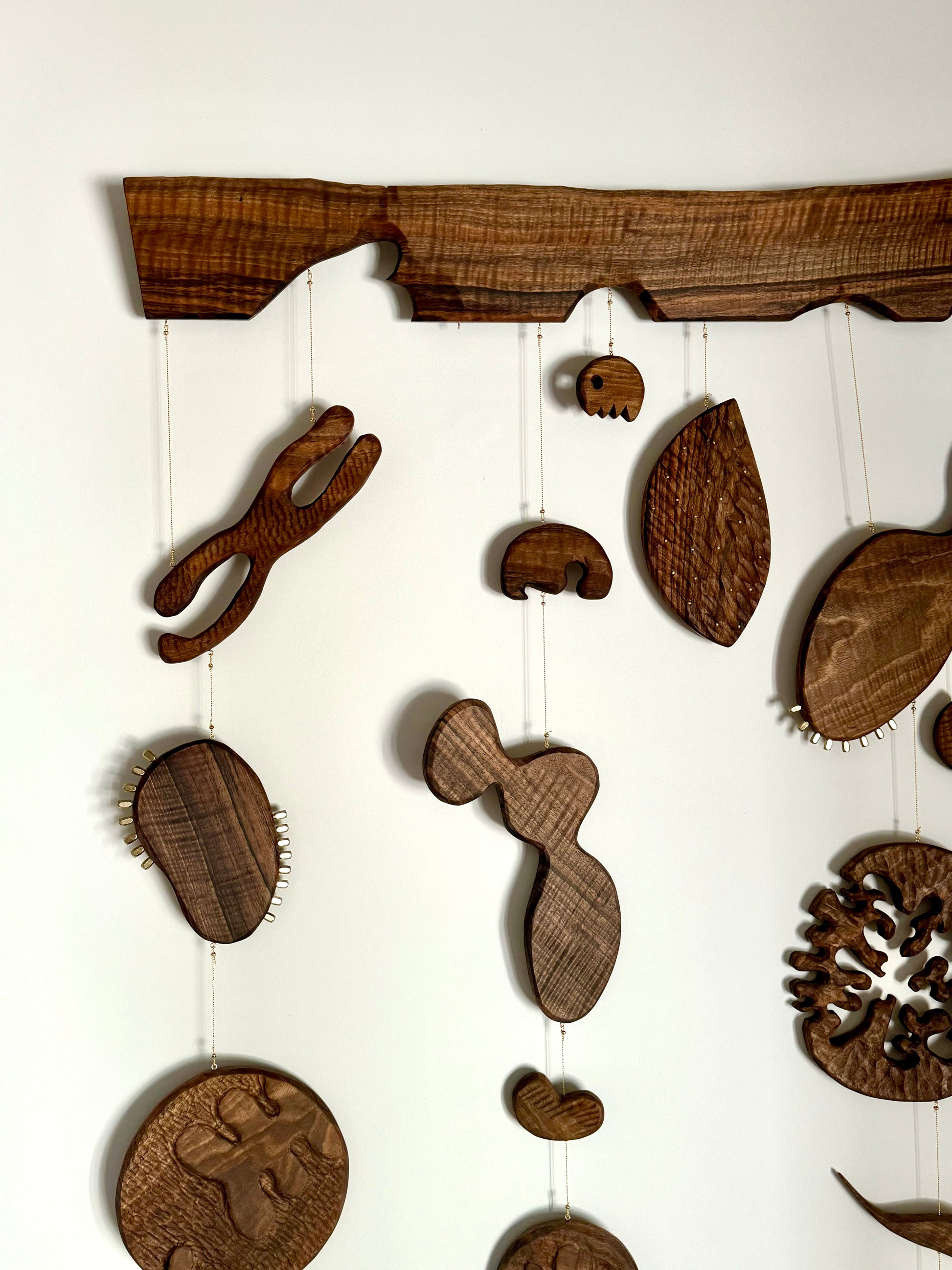Le noyer, bois de force et de protection, est associé au laiton, métal précieux et lumineux. Ensemble, ils créent une œuvre murale unique qui évoque les forêts primaires et les rites ancestraux.