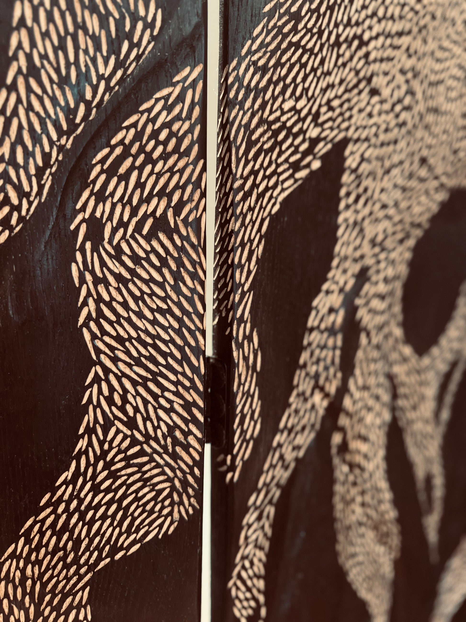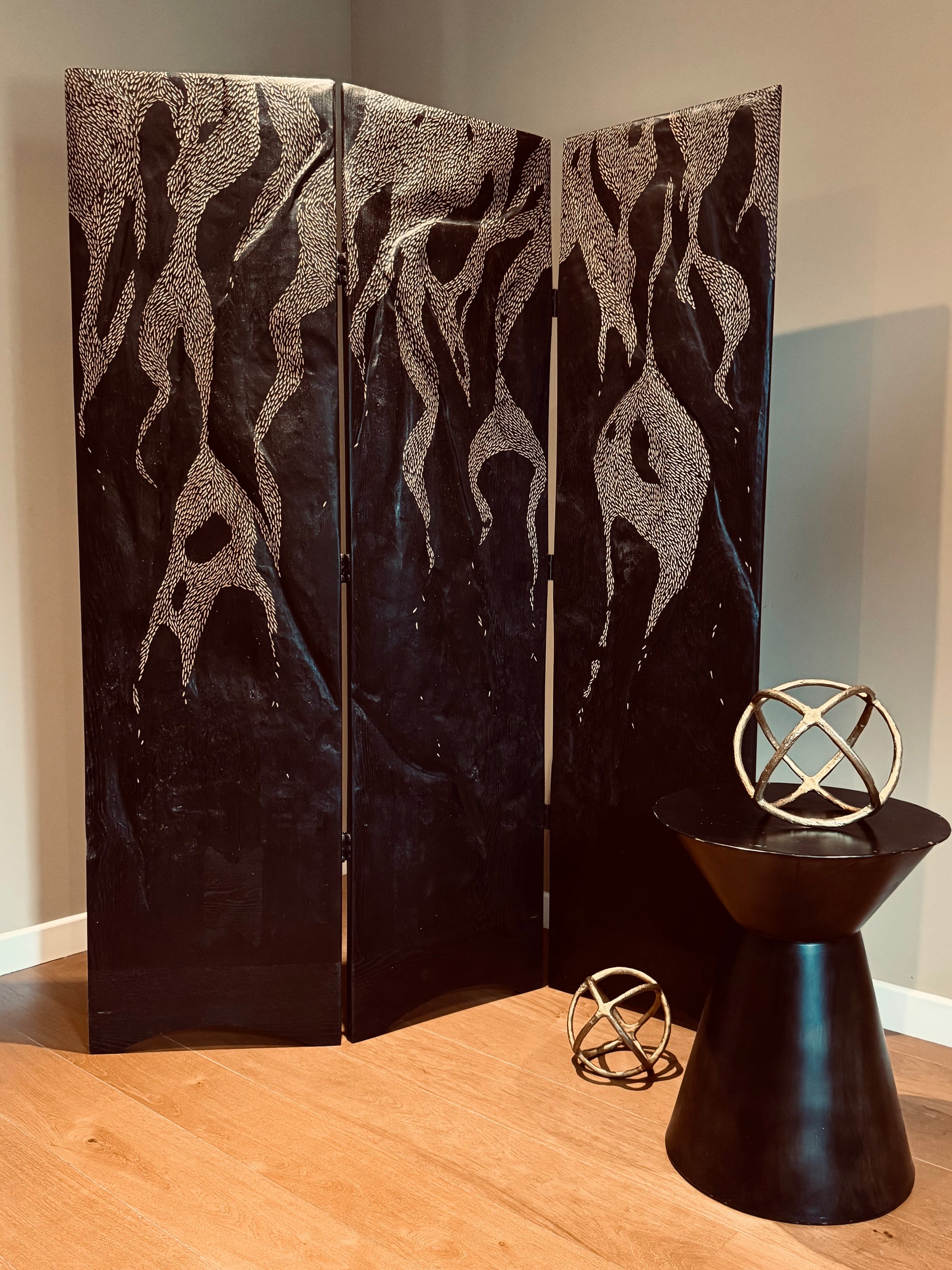 Ce paravent à trois pans, réalisé en chêne teinté et sculpté, capture l'énergie et la dualité de l'équinoxe, moment d'équilibre parfait entre l'ombre et la lumière.