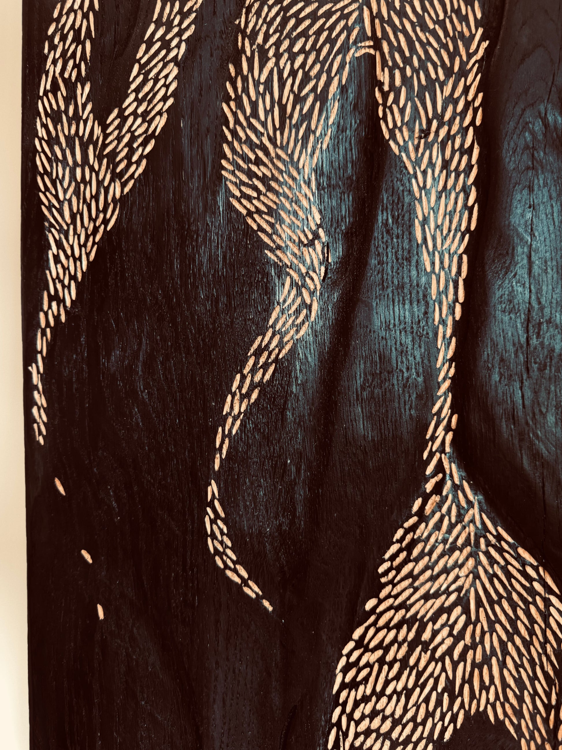Les motifs sculptés à la gouge évoquent la montée des sèves ou la danse des flammes vers le haut, symbolisant la force vitale et le changement de saison. Les contrastes de textures et de volumes captent la lumière, créant une sensation de mouvement et de profondeur immersive.